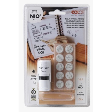 NIO-stämpel med kalendermotiv, ett roligt sätt att pryda kalendrart och notiser! Setet innehåller en NIO-stämpe,l en pincett, en svart stämpeldyna samt 10 kalendermotiv: Lysande glödlampa, kaffekopp, flygplan, penna, TO DO…, stetoskop, bakelse med ljus, pil, hantel och en kundvagn. Stämpelavtrycken är 15 mm i diameter.